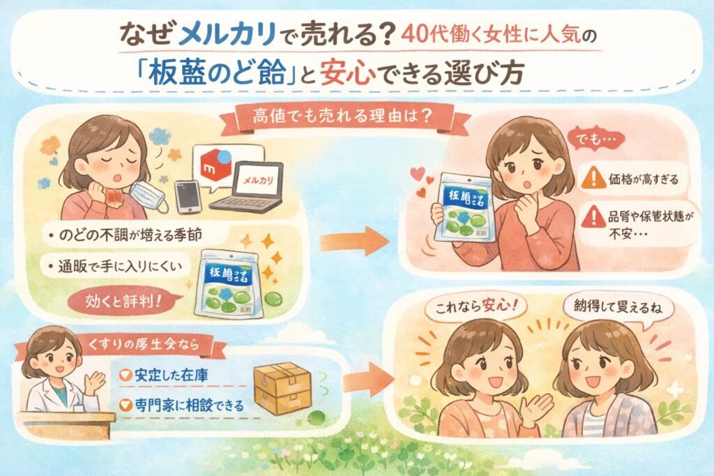 最近、「イスクラの板藍(ばんらん)のど飴」がメルカリなどで高値なのに売れている…という声をよく聞きます。くすりの厚生会としては、できれば会員店舗(相談できるお店)から買ってほしいです。理由はシンプルで、安全面と価格面で、結局そのほうが納得しやすいからです。