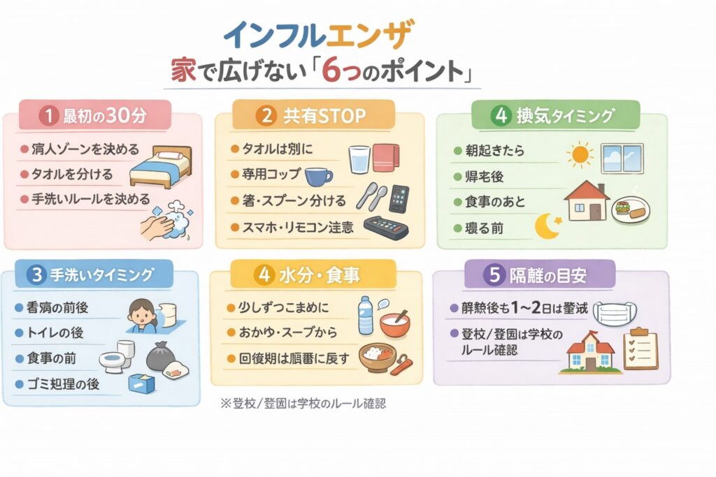 インフルは、熱が下がったからといって、すぐに“もううつらない”とは言い切れません。家庭内は距離が近いので、熱がある間は隔離強め、熱が下がっても共有ストップや手洗いのルールは1〜2日続けるくらいが安心です。
