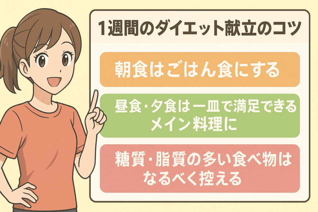 1週間ダイエットは、短期間で体重を落とすための集中プログラムです。糖質や脂肪を無理なく減らし、たんぱく質・ビタミン・ミネラル・食物繊維をしっかり摂取することで脂肪燃焼を促します。例えば、朝食にオートミールと豆乳スムージー、昼食に鶏むね肉とブロッコリーのサラダ、夕食に野菜たっぷりのスープを組み合わせれば、カロリーを抑えながら満腹感を得ることが可能です。